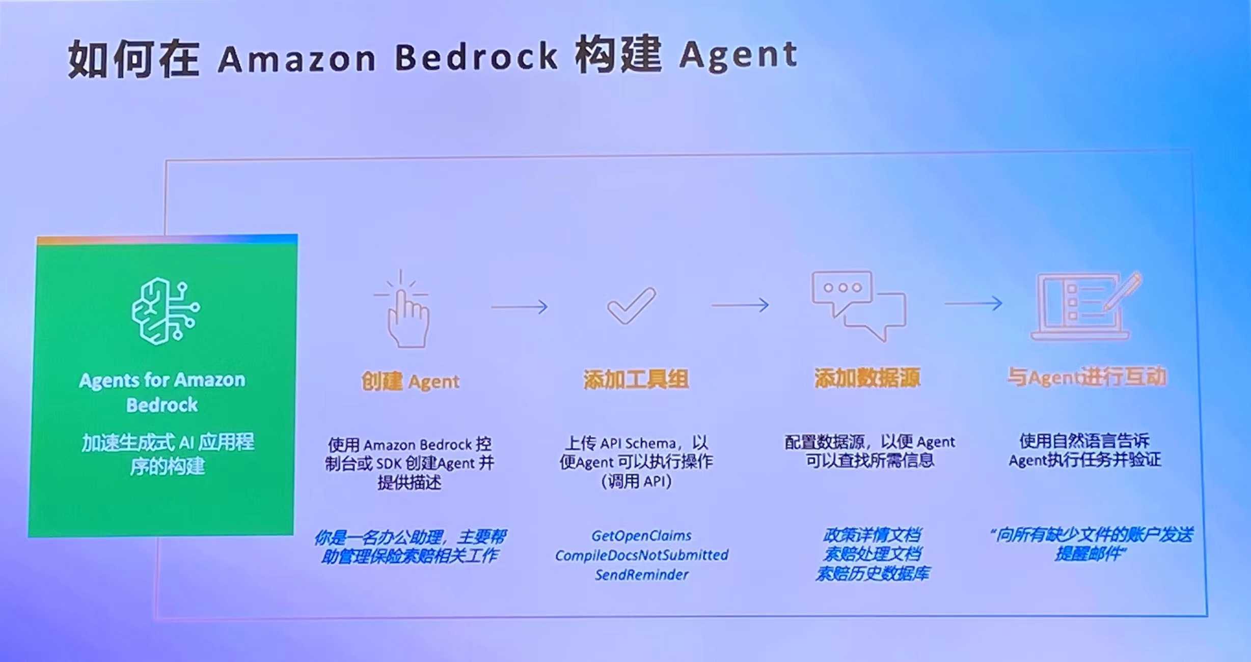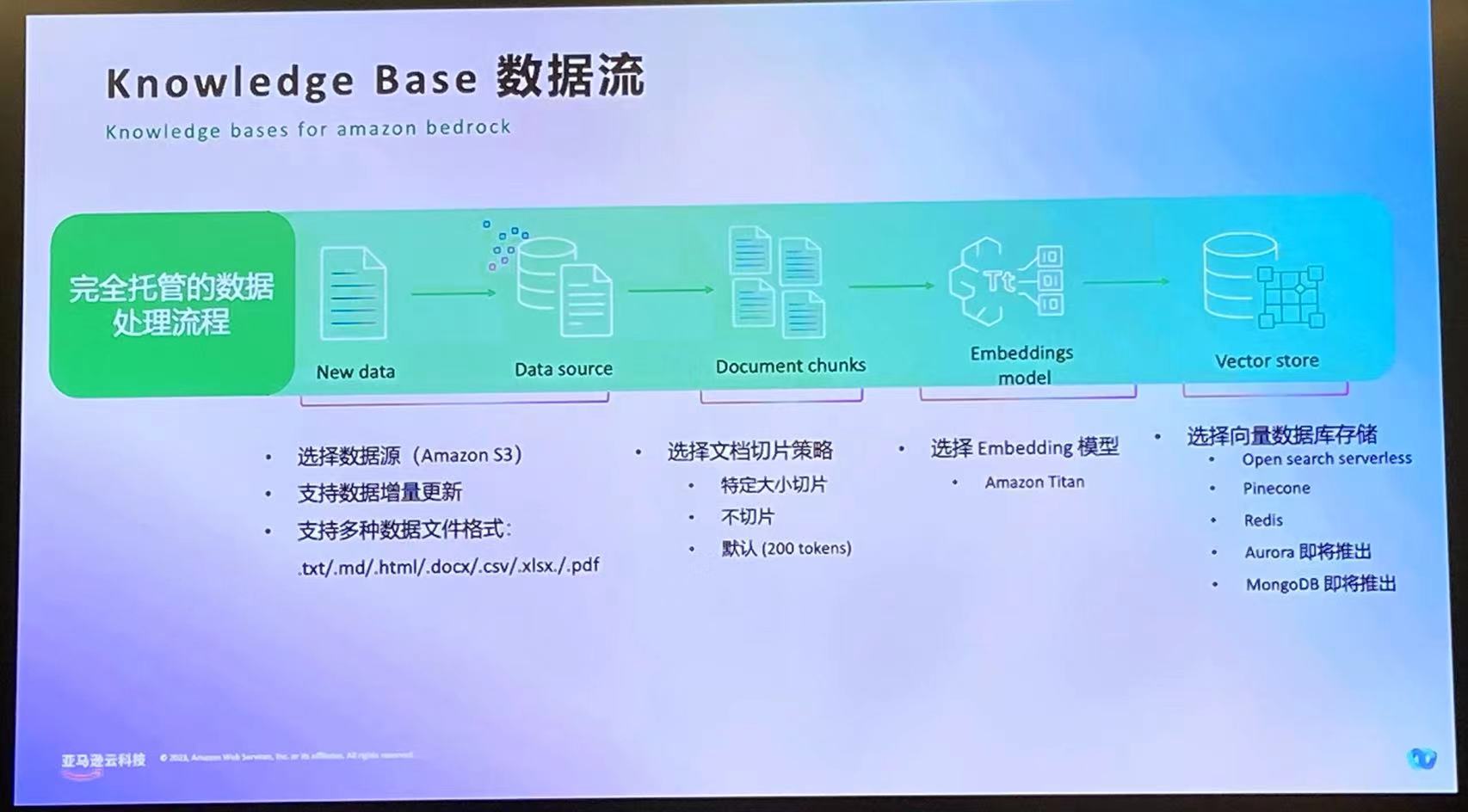 Bedrock与Claude 3提供了广泛的应用场景,涵盖了从视觉理解、图像处理、文本生成到对话交互等多个领域。其核心功能包括:视觉认知能力,如图像理解、目标检测、图像分割、图片翻译等,能够高效处理各种视觉内容。文本生成能力,可生成多种类型的文本,如摘要、故事、营销文案等,同时支持根据上下文生成相关内容。对话交互能力,能与用户进行自然语言对话,回答问题、提供建议,并支持个性化定制。此外,Bedrock还提供了RAG(Retrieval Augmented Generation)功能,将知识检索与生成相结合,输出更加准确、信息丰富的内容。代码辅助、数据处理、代理操作等能力,也为开发者提供了全方位的支持。以下是一些使用Bedrock的应用场景举例: 1. 使用Bedrock构建RAG应用 1. 提升办公体验,智能写作助手 Amazon Bedrock 构建的知识增强生成系统(RAG)为用户提供智能写作辅助,通过融合检索和问答、语法检查等功能,提升用户文档创作体验。该系统能够根据用户输入的关键词或主题,从知识库中检索相关内容,并将其智能整合到文档中,辅助用户撰写。同时,系统还具备语法纠错、上下文关联等增强功能,确保输出内容的连贯性和准确性。无论是生成长文本、摘要,还是回答问题,RAG系统都可以给出高质量的响应,大幅提高写作效率,为用户带来智能化、个性化的写作体验。 2. 基于 AI 与文档对话,重构阅读方式 – 智能 AI 阅读助手 APP 亚马逊Bedrock构建的知识增强生成系统(RAG)融合了AI与文档处理,为用户提供智能AI阅读助手APP的功能。该系统能够智能阅读文献内容,批量文献总结,提高阅读效率。同时,它还支持针对文献实时交互对话,轻松获得智能解读,高效理解复杂内容。通过将知识检索与内容生成相结合,RAG系统为用户带来全新的文献阅读和理解体验,大幅提升学习研究效率,是基于AI与文档对话的重要创新应用。 3. 快速完成产品升级,提供企业级生成 AI 知识应用产品 利用Amazon Bedrock的构建框架,企业可以快速定制和构建出适合自身需求的AI应用场景,例如基于知识库的问答系统、智能文档摘要和理解等。Amazon Bedrock在数据安全层面给予充分保障,保证了企业的数据和模型在其私有云环境中安全部署和运行,并与Amazon的知识服务和模型(如VPC)相集成,确保数据的私密性和安全性。另外,它还支持与Amazon OpenSearch Service无缝集成,实现对大规模文档的高效检索和理解,为企业内部提供优质的知识管理和共享平台。 2. 使用Bedrock构建角色扮演应用 1. AI角色聊天,AI伴侣/AI聊天机器人 可以定制个性化角色,从而提供更具吸引力和沉浸感的交互体验。该服务提供24/7全天候运营,用户可以随时与AI伙伴进行自然对话和互动。AI伙伴不仅具备游戏和娱乐功能,还能分析用户偏好,为用户推荐个性化的内容,如电影、书籍和电视节目等。通过Amazon Bedrock,开发者能够轻松构建引人入胜的AI伙伴应用,满足用户对于智能虚拟伙伴的需求。 2. 为用户提供情绪陪护 通过Bedrock构建的角色扮演应用,,用户可以与AI助理进行自然地对话互动,涵盖高度定制化的设置、地点识别、语音识别等多种场景。这种AI对话系统累计服务了超过一万种用例,总共支持了7000万次人机对话。无论是应用于线上线下的产品销售,还是企业客户服务场景,Amazon Bedrock都能为AI助理赋能,提供高效、人性化的虚拟助理体验,是构建智能助手服务的强大底层技术支撑。 3. 使用Bedrock构建文本分析类应用 Amazon Bedrock能够对用户在游戏中的即时文字聊天进行分析,识别出存在于聊天内容中的色情、广告、骚扰等不当内容,并对这些不合规内容进行审查和过滤。同时,它也能识别多种语言和语境,确保在不同场景下都能准确理解用户交流的本质含义。 该服务利用自然语言处理和深度学习等技术,对聊天语料进行情感分析、主题识别等处理,为用户提供贴心周到的语料筛选和分析洞见。这种强大的文本分析能力,能够为游戏开发者营造安全、健康的在线游戏环境,提升用户体验,是Amazon Bedrock在游戏行业的重要应用场景之一。 4. 使用Bedrock构建文本生成类应用 Amazon Bedrock利用人工智能技术优化了亚马逊商品的文案内容,为顾客提供更精准、易懂的产品评论和描述信息。它通过分析15亿条用户评论和评级数据,自动生成具有高质量和准确度的评论摘要,为顾客呈现简洁有力的产品评价,提升了用户的购物体验。 该解决方案将人工智能与电商业务深度融合,通过智能生成文本的方式,不仅减轻了人工编写产品描述的工作负担,更能确保产品信息与客户真实需求高度匹配,帮助客户做出更明智的购买决策。 5. 构建智能电商搜索推荐应用 通过利用Bedrock提供模型的自然语言处理和机器学习能力,可以为用户提供个性化的商品推荐和智能搜索服务。该系统结合了用户历史数据、购物偏好和搜索记录等信息,利用Bedrock的模型,对用户需求进行分析和理解。系统会自动生成个性化商品推荐列表,并提供智能问答和搜索优化,帮助用户快速精准地找到想要的商品。
